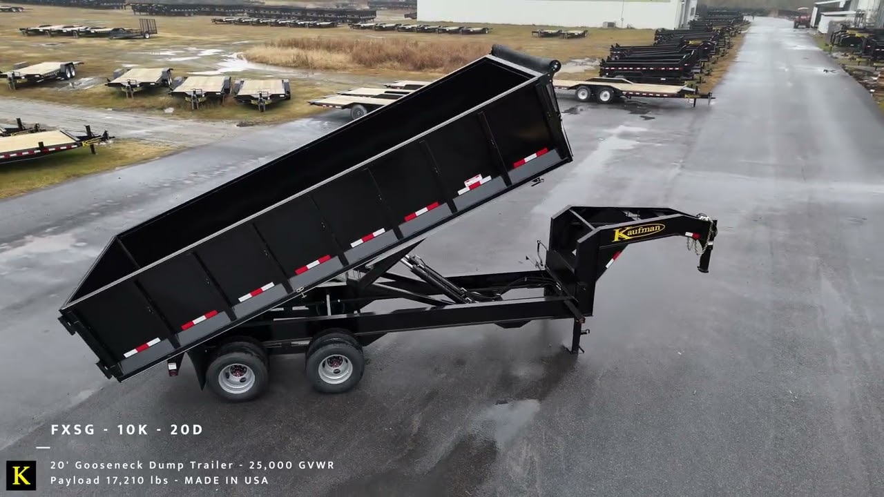 Kaufman Trailer's Heavy Duty 25000 GVWR Deluxe Tandem Dual Gooseneck Dump Trailer is offered in 20 ft. standard length with 90 in. of usable width inside the bed. This dump trailer is built to commercial use standards with many great heavy duty features. We start with a 12" I-beam main frame, uprights, and gooseneck riding on 10,000 lb. Dexter dual wheel axles. The dump box is built with a tubing frame and channel cross-members, and has a one-piece 10 ga. (.135") floor. We offer an optional super duty 3/16" (.187") available thickness as well. This is a one-piece, full length floor with no seams. The sides have a 45 degree turn where they join the floor to minimize dirt sticking in the corners when dumped. The sides are built with 3x3 square tubing and are welded solid. Self cleaning rock guards are standard on the outside. These sides are much stronger than the bolt on sides of most of our competitors. They are built with similar construction to dump truck beds. There are D-rings on the floor in all four corners and two in the middle to tie down equipment you may haul. 8' triple tube aluminum ramps, designed especially for this trailer, are standard and are mounted in an easy to remove location just ahead of the axles. Our heavy duty scissor features twin cylinders for powerful and stable dumping. A heavy duty tarp kit is included standard.