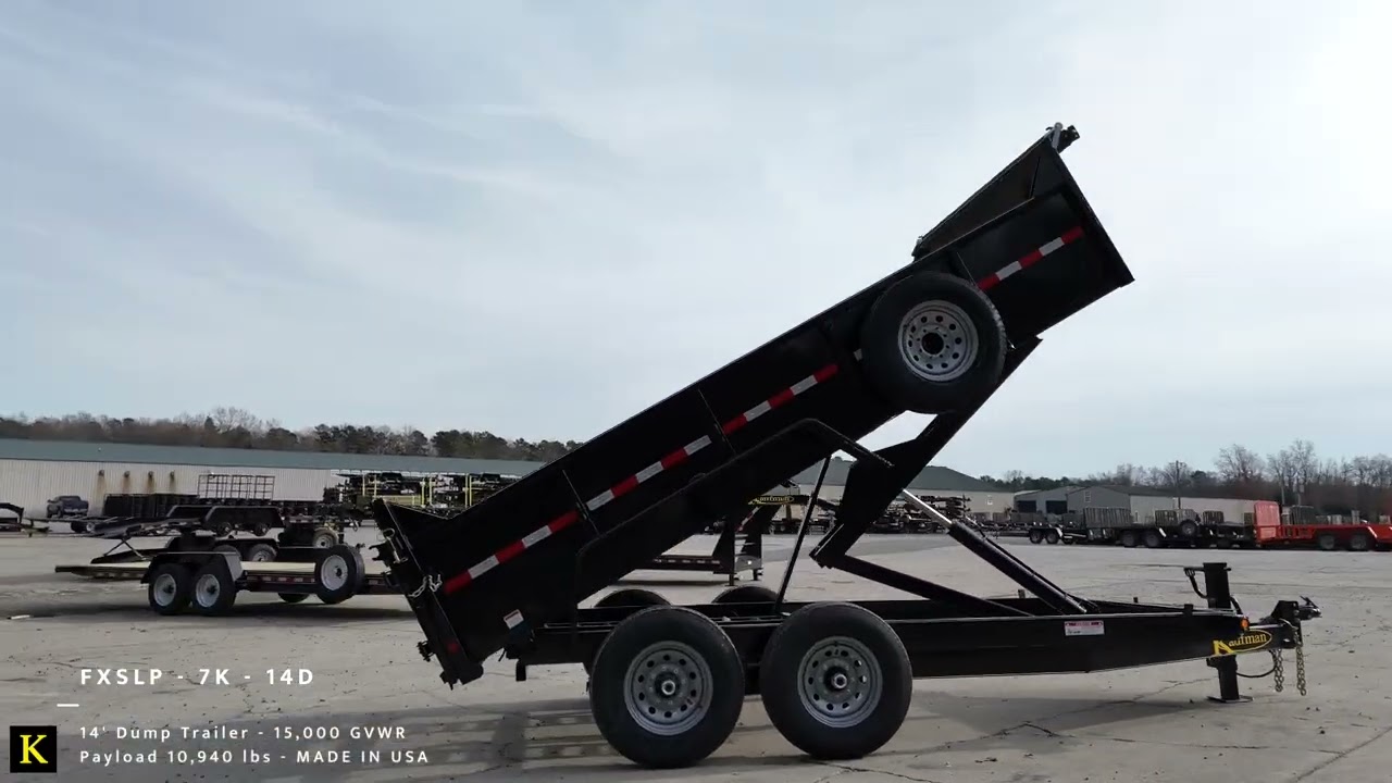 Kaufman Trailer's Deluxe Heavy Duty Dump Trailer is available in 14 ft. x 80 in. size. This trailer is great for the professional landscaper or roofer who wants a long lasting dump trailer with heavy duty quality features. The frame is 6" channel with a 6" channel tongue. The dump box is built with a tubing frame and channel cross-members, and has a one-piece 10 gauge floor. We also offer a heavy duty .187" (3/16") steel floor option. The one-piece floor has d-ring tie-downs on all four corners. The combination barn doors and spreader tailgate allow you to open the doors wide to dump a load of trash or set the chains to spread gravel. The 6' loading ramps slide in under the floor. The tailgate does NOT need to be removed to use the loading ramps.